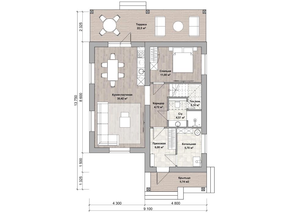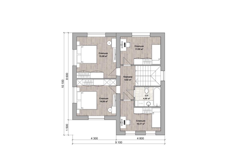 - Габаритные размеры дома 8,6 м х 9,1 м