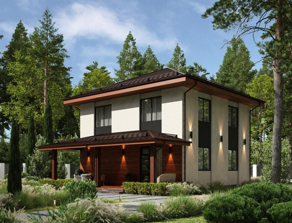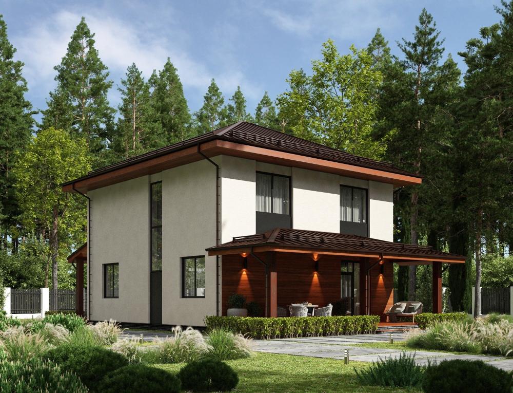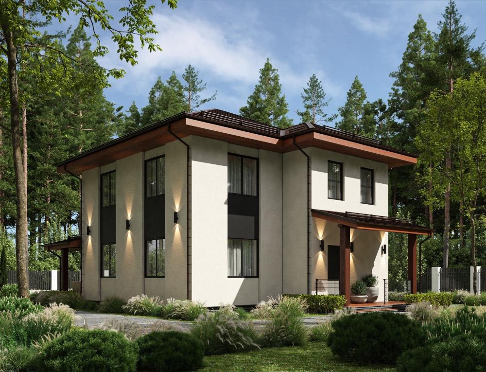 Проект изящного двухэтажного дома с 5 спальнями. Подойдёт для семьи из 5-8 человек. В просторной гостиной поместится большая компания. Часть места занимают столовая группа и кухня, есть выход на крытую террасу. Одна из спален на первом этаже, еще 4 наверху. Для удобства жильцов устроены ванные комнаты на обоих этажах и котельная. Дом выглядит стильно, большие окна визуально расширяют пространство помещений. Хорошо впишется в загородный участок, украсит городскую улицу.
