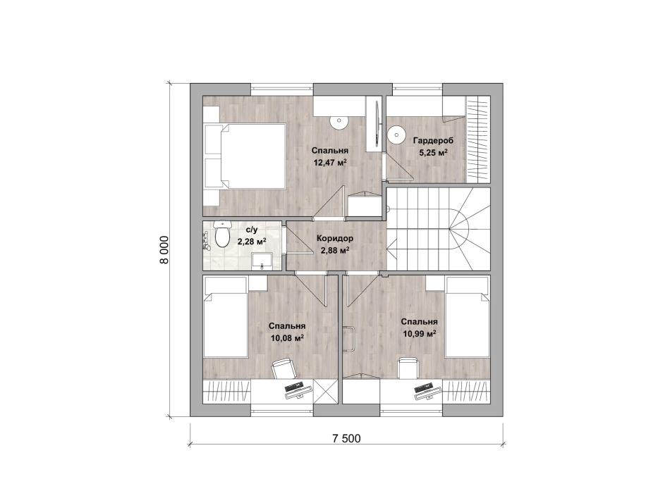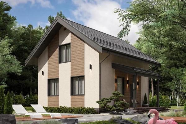 Бюджетный дом с гаражом. Подойдёт для небольшой семьи из 3-4 человек. Благодаря сдержанной внешней отделке впишется в городской квартал, улицу коттеджного поселка. Может использоваться как дачный и гостевой дом. Классическая планировка. Внизу прихожая, гостиная с кухней в нише, ванная и бойлерная. Лестница соединяет открытую зону и приватный мир.