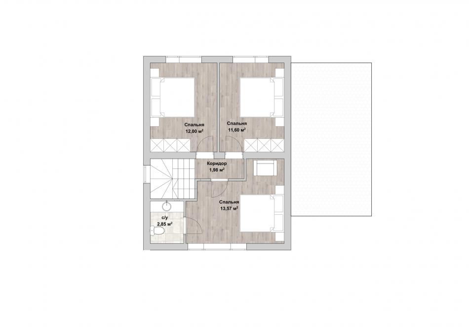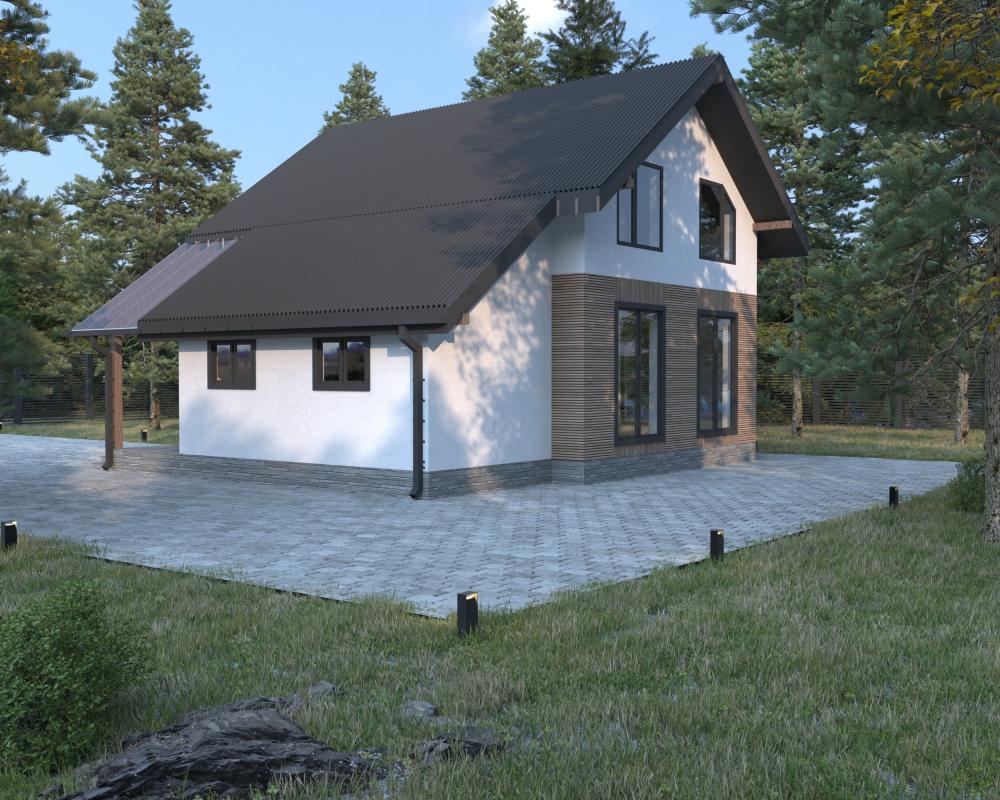 Компактный двухэтажный дом для круглогодичного проживания семьи из 3-4 человек. Такой удачно впишется и в городской участок, и в загородный. Необычный прозрачный навес защищает вход от осадков. Веранда играет роль тамбура, здесь же двери в котельную. В прихожей есть место для шкафов. Слева от входа кабинет, где можно спокойно работать в уединении. Дальше просторная ванная комната. Справа от входа светлая кухня-гостиная с 3 большими окнами. На втором этаже расположены 3 спальни. К одной из них примыкает персональный санузел. Окно над лестницей освещает коридоры обоих этажей, обеспечивает безопасность на ступеньках. Проект – отличное решение жилищного вопроса для молодой семьи.