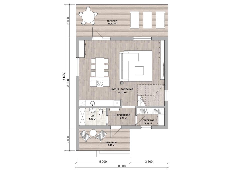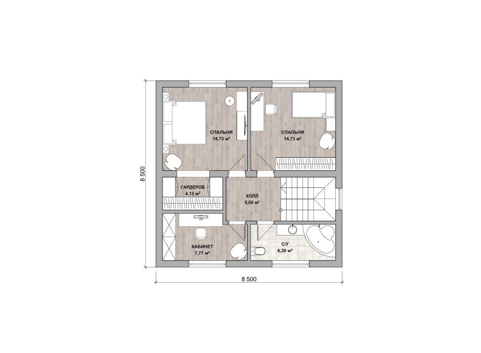 - Габаритные размеры дома 8,5 м х 8,5 м