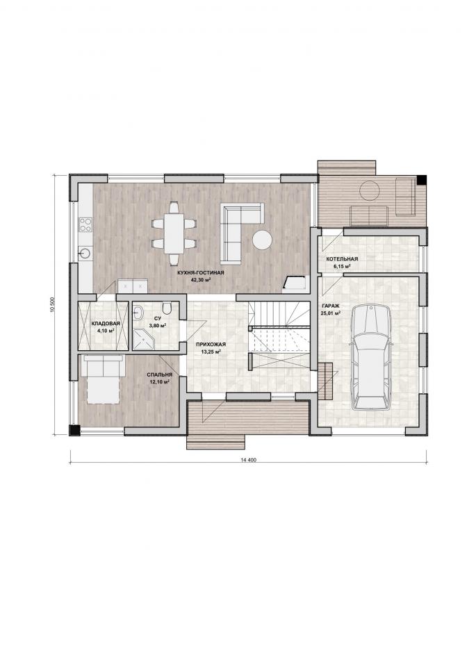 - Габаритные размеры дома 10,5 м х 14,4 м