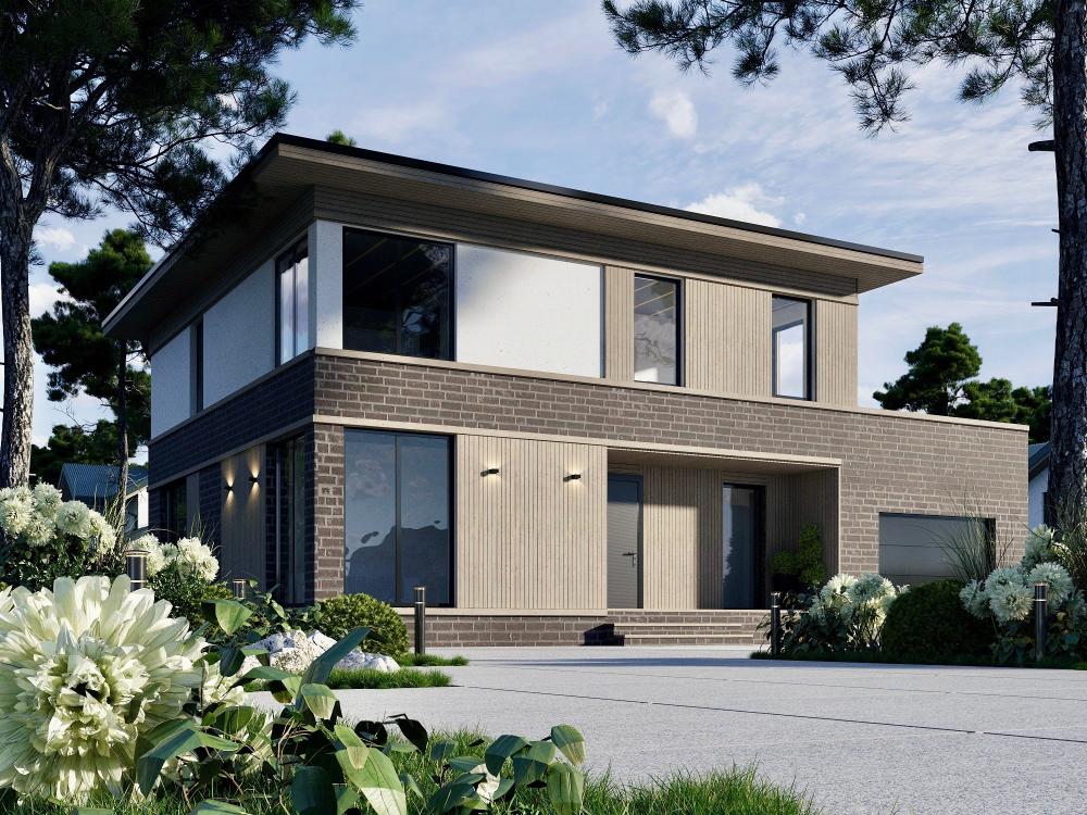 Солидный дом с гаражом для комфортной жизни большой семьи из 4-8 человек. Здесь всё дышит удобством и достатком. В просторной гостиной с камином много места для отдыха, семейных обедов. Рядом кухня с кладовой. Из холла двери ведут в спальню, санузел и в гараж, оттуда в котельную и на террасу. На втором этаже 3 большие спальни, к одной из них примыкает вместительная гардеробная. Из спален есть выход на террасу над гаражом. Панорамное остекление делает помещения максимально светлыми, а здание стильным и гармоничным.