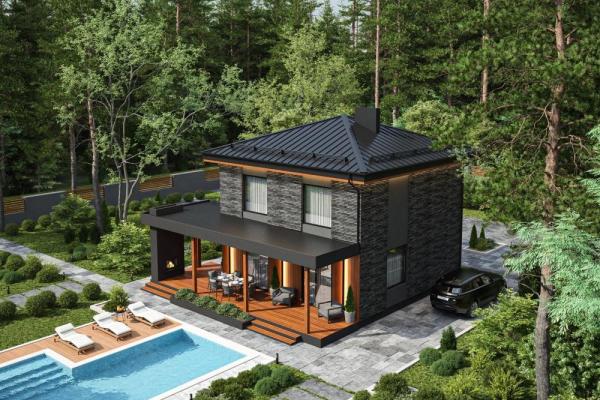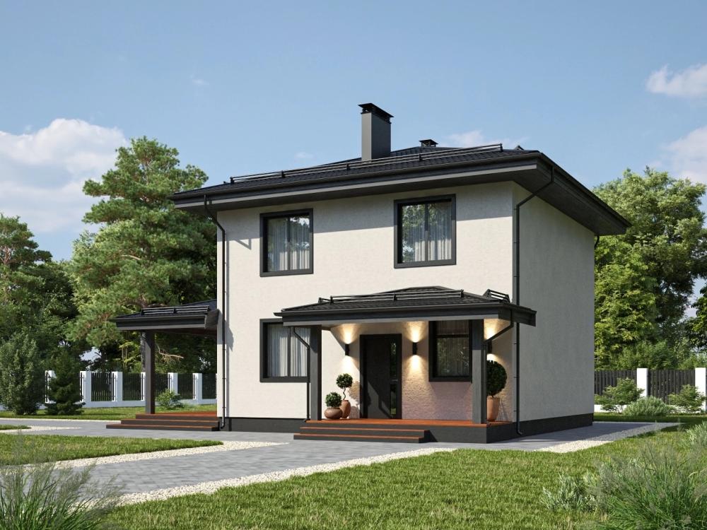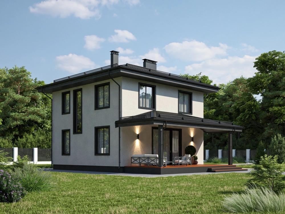 Проект двухэтажного дома для круглогодичного комфортного проживания семьи из 3-6 человек. Впишется в городской и загородный участок. Гостиная с кухонной нишей – самое большое помещение в здании. За счёт освещения с 3 сторон комната кажется больше, а закрытая терраса действительно удваивает пространство. На первом этаже также расположены гостевая, прихожая и санузел с выходом в котельную. Наверху находятся удобная ванная, одна спальня с гардеробной и две с 2 окнами. Окна делают дом изящнее снаружи и светлее изнутри.