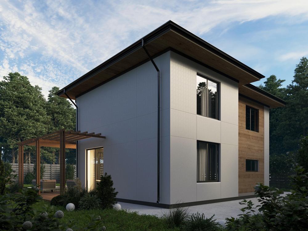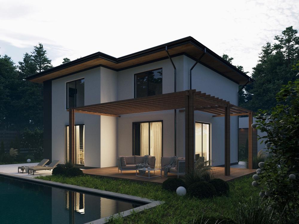 Проект двухэтажного дома для ценителей комфортной, размеренной жизни. Подойдёт как для городского, так и для загородного участка. Первый этаж располагает квадратной гостиной и столовой с кухней. Комнаты освещаются панорамными окнами, сообщаются между собой, есть выход на террасу. У входа в дом находятся гостевая спальня, санузел с душевой. Пространство под лестницей использовано под котельную. Три просторные спальни занимают второй этаж. Туалет, роскошная ванная комната и лестница наверх оборудованы окнами. Отделка и форма здания с улицы сдержанная и строгая. Со стороны двора панорамные окна делают дом похожим на виллу, говорят о статусе и стиле хозяев. .