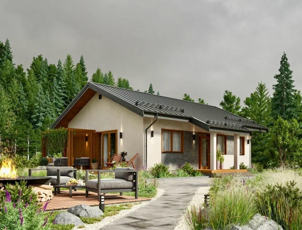 Проект небольшого одноэтажного дома для семьи из 2-4 человек. Бюджетный эргономичный дом впишется в любой участок и пейзаж. Станет любимым семейным гнездом или дачным домиком. Крыльцо с навесом и прихожая на страже микроклимата. Прямоугольная светлая кухня-гостиная почти удваивается с выходом на террасу. 2 спальни отделены от общего пространства толстыми стенами. Ванная комната и котельная обеспечат комфорт и уют. Проект подойдёт молодой семье, пенсионерам, любителям жизни в максимальной близости с природой.