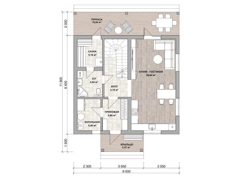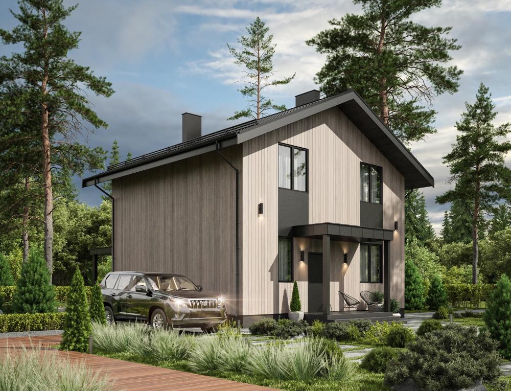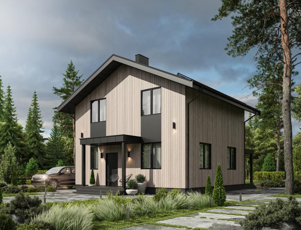 - Двухэтажный дом с сауной – новый уровень комфорта. Совмещает в себе привычную планировку и домашнюю “душегрейку”. Большую часть первого этажа занимает кухня-гостиная с выходом на крытую террасу. Туда же ведёт вторая дверь из сауны, примыкающей к ванной. Наверху типичная планировка: 3 спальни, ванная и гардеробная. Дом подойдёт для семьи из 3-5 человек. Идеально для строения на берегу реки или озера.