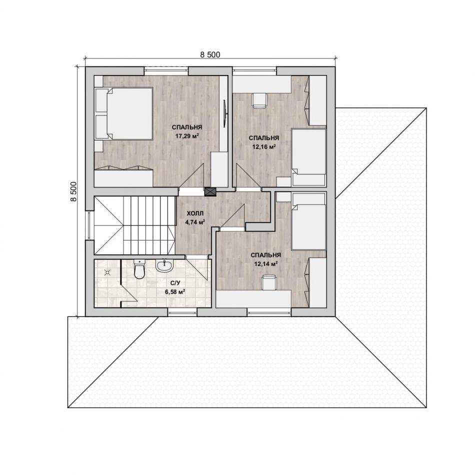 - Габаритные размеры дома 8,5 м х 8,5 м