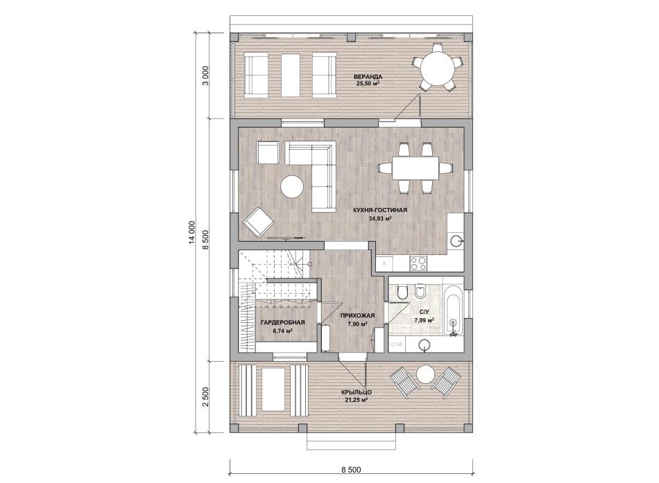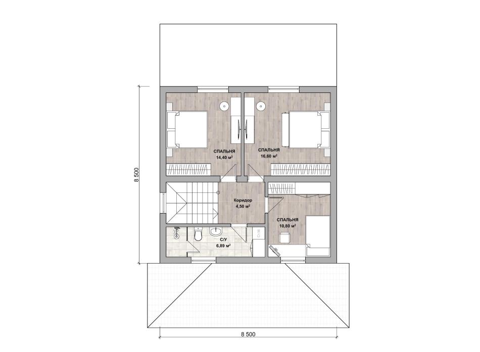 - Габаритные размеры дома 8,5 м х 8,5 м
