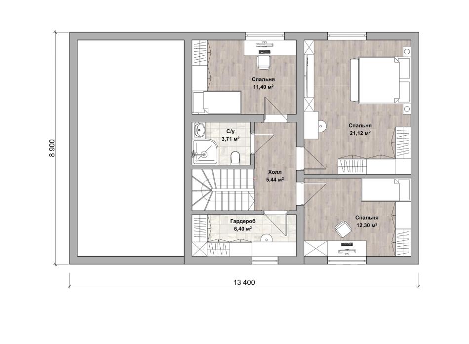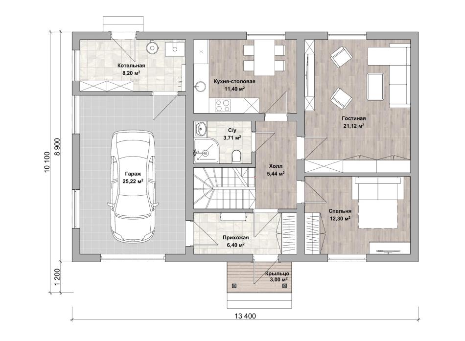 - Габаритные размеры дома 13,4 м х 8,9 м