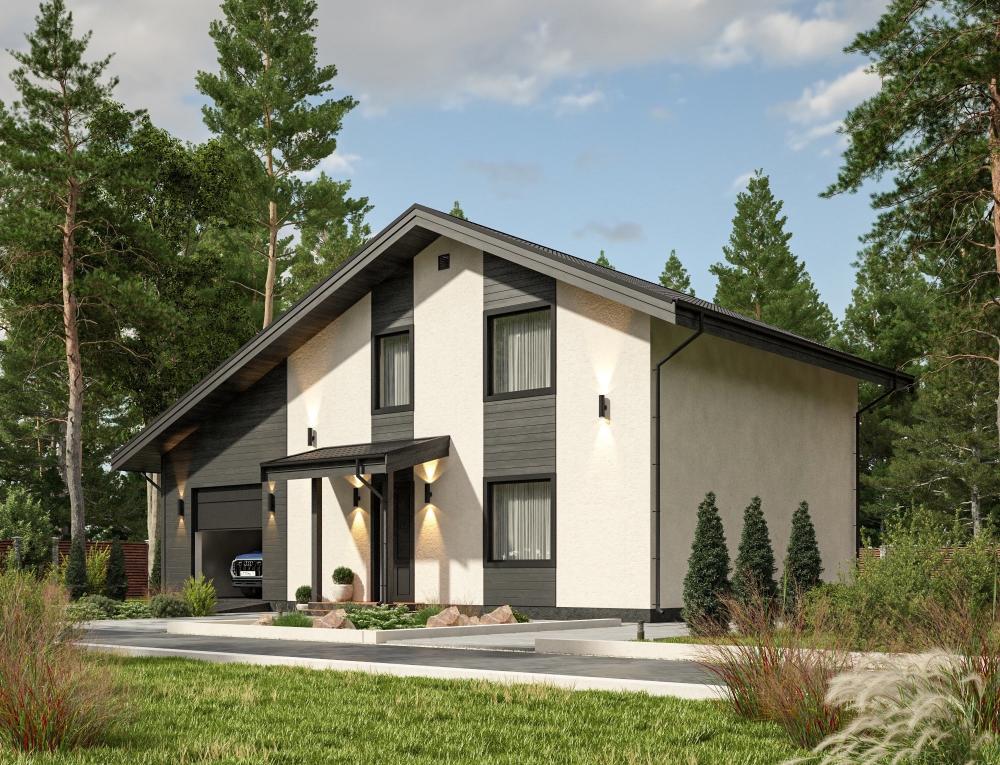 Проект дома с гаражом. Удобный и эргономичный, рассчитан на постоянное проживание семьи из 4-6 человек. Комбинированная отделка стройнит здание. Часть пристройки под гараж занимает котельная, поэтому удалось сделать отдельную кухню-столовую. Гостиная служит местом сбора домочадцев и приёма гостей. В доме 4 спальни, 2 ванные комнаты и гардеробная. Много места, света и воздуха. Интересный проект при использовании стандартных приёмов проектирования.