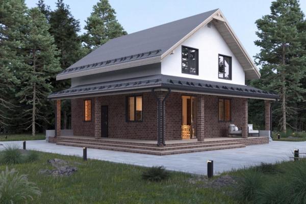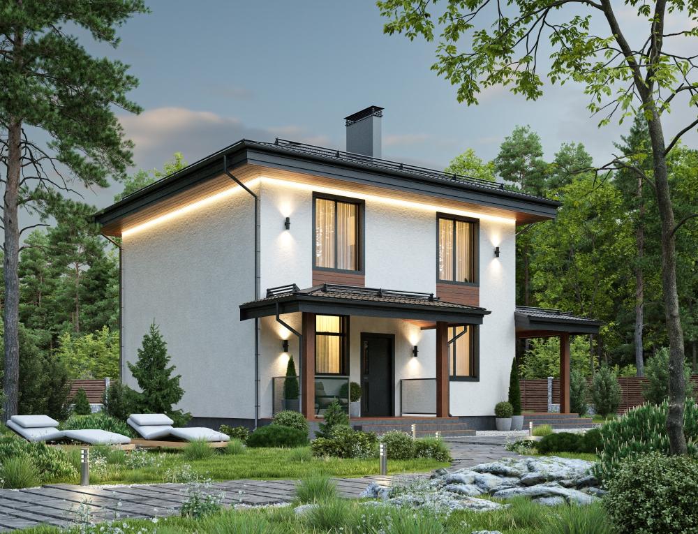 Проект двухэтажного дома. Оптимальный размер для семьи из 4-5 человек. Подходит к круглогодичному проживанию благодаря тёплой прихожей, котельной. Впишется в городской и загородный участок благодаря классической внешней отделке, эффектной подсветке. Половину первого этажа занимает светлая гостиная с кухонной зоной, огромным панорамным окном и выходом на просторную крытую террасу. С другой стороны расположены котельная-гардеробная, санузел и гостевая спальня. На втором этаже 3 спальни, гардеробная и ванная комната.