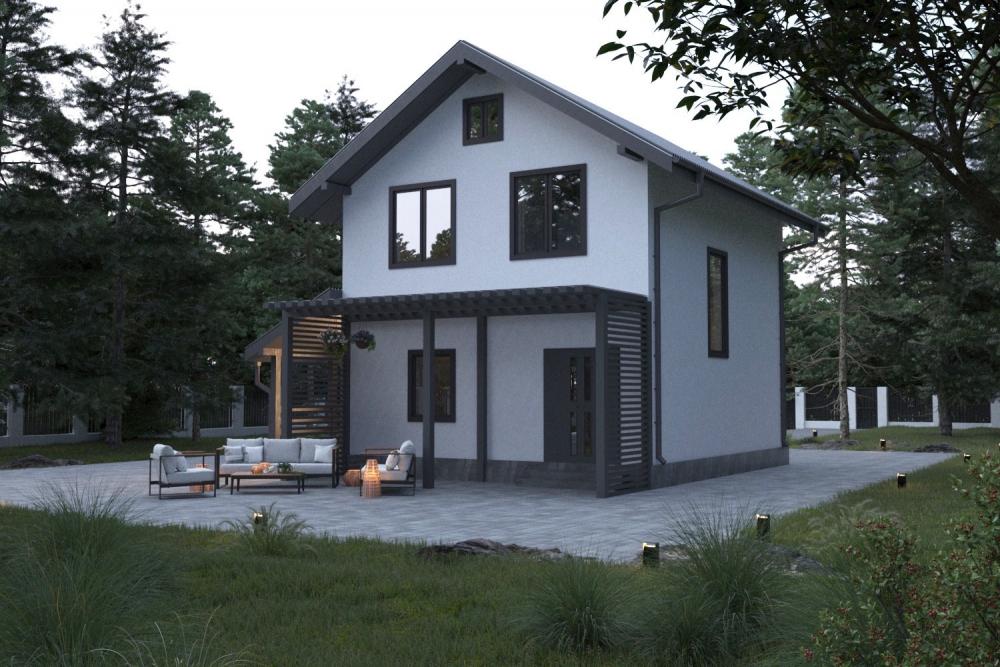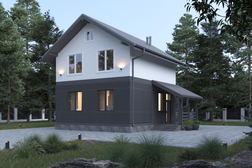 Проект бюджетного дома для небольшой семьи. Входную дверь защитит от осадков крыльцо с навесом. В прихожей нашлось место для шкафа, дальше открывается гостиная с кухонным уголком. Справа от входа ванная, котельная и лестница наверх. На втором этаже расположены три небольшие спальни, удобная гардеробная и санузел. Из котельной есть выход в сад, там можно устроить террасу для отдыха. По желанию хозяев котельная и гардеробная могут поменять свое назначение. Молодой семье из 3-5 человек будет уютно в этом доме круглый год. Такой легко разместится даже на тесном городском участке.