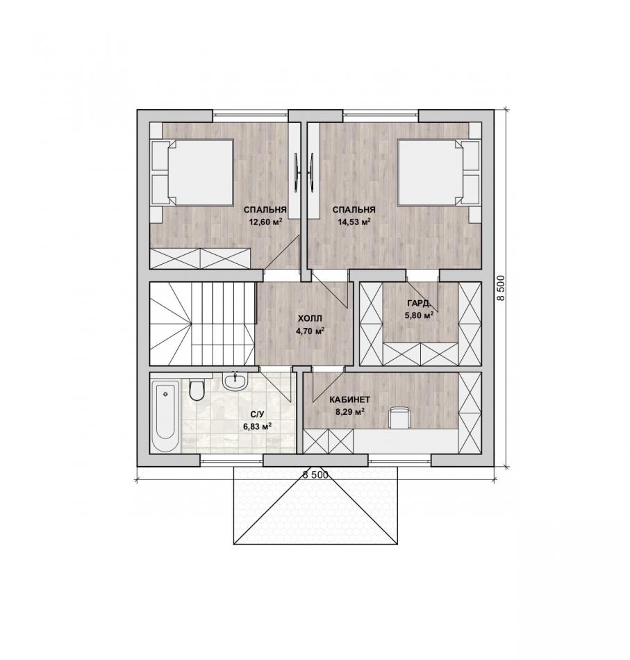 - Габаритные размеры дома 8,5 м х 8,5 м