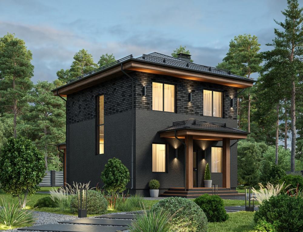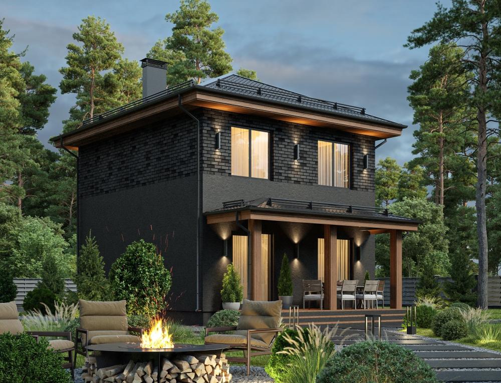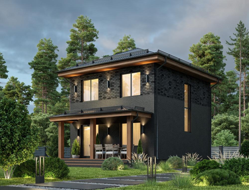 Проект компактного двухэтажного дома для семьи из 3-4 человек. Достаточно бюджетный, с полным набором удобств. Благодаря размерам поместится на любом участке, выглядит достойно. На первом этаже прямоугольная гостиная. Комната зонирована для отдыха, приготовления еды, совместной трапезы. Выход на крытую террасу и панорамные окна визуально увеличивают площадь помещения. Рядом ванная комната и котельная, где много места для хранения. На втором этаже 3 спальни. В доме ничего лишнего, зато есть всё нужное для комфортной жизни небольшой семьи. За счёт отделки и подсветки здание смотрится современно и солидно.