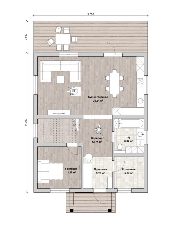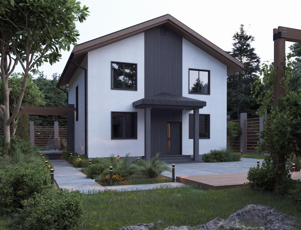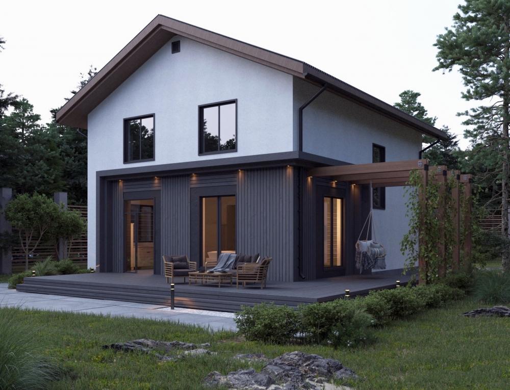 Удобный, бюджетный, двухэтажный дом с 5 спальнями для большой семьи. 5-8 человек разместятся в нём со всеми удобствами. Здесь всё просто, функционально и уютно одновременно. В отделке фасада штукатурка и лиственница отлично дополняют друг друга. Котельная, ванная расположены у входа. Двери в гостевую спальню под лестницей наверх. Гостиная совмещена с кухней и столовой. Окна в пол и стеклянные двери наполняют комнату светом, визуально увеличивают. Открытая терраса и консоли с подвесными креслами дополняют общее пространство. Второй этаж наполнен 4 просторными спальнями и ванной с душевой кабиной. Идеальный проект дома для круглогодичного проживания большой и дружной семьи.