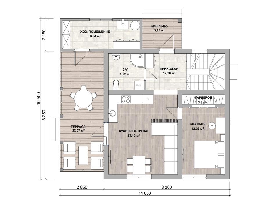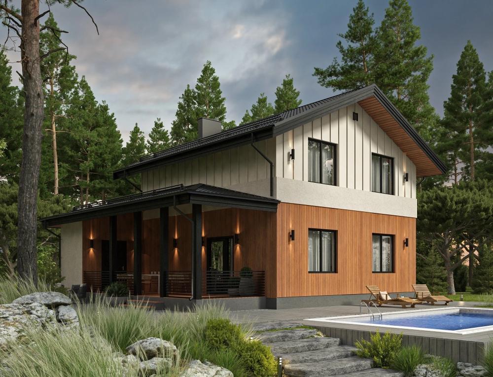 Проект небольшого двухэтажного дома с крытой террасой – мечта гостеприимной семьи из 3-5 человек. Уютная гостиная совмещена с кухней. Из комнаты двери ведут в спальню с гардеробной и на террасу. Терраса заканчивается хозяйственным помещением с котельной и стеллажами. Второй этаж начинается со светлого холла. Оттуда двери ведут в 2 просторные спальни, в каждая своя гардеробная. На обоих этажах свои ванные комнаты. Дом довольно компактный, подойдёт как для городского участка, так и для загородного.