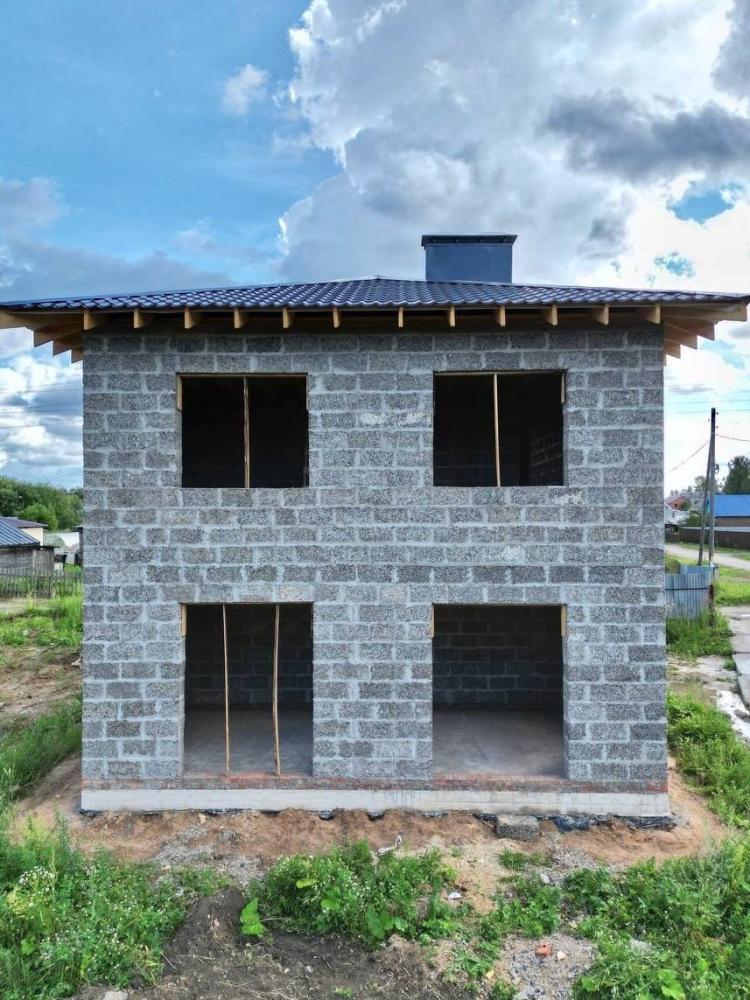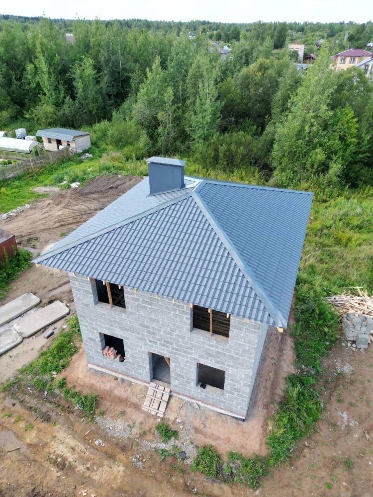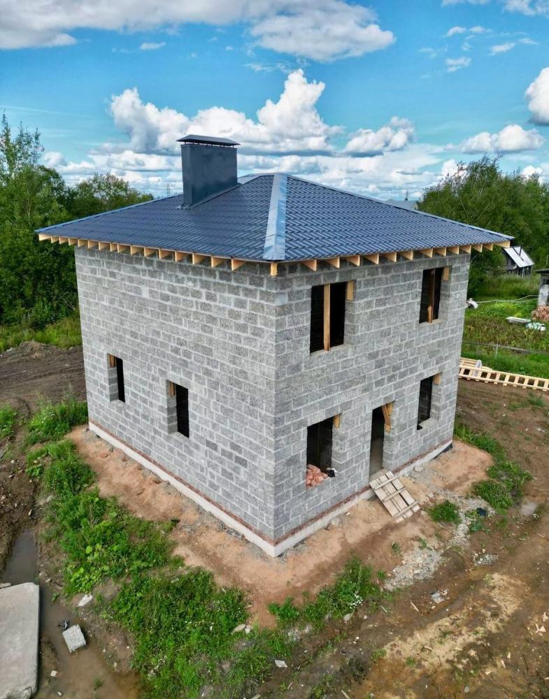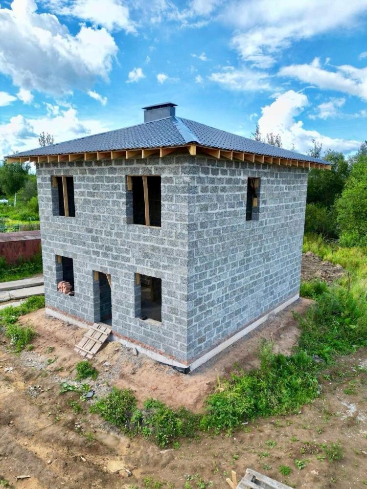 Все, как вы любите. 2 этажа, крыша четырёхскатная под металлочерепицей, в основании утеплённая железобетонная плита. Стены из арболитовых блоков от Первый Арболитовый Завод, внешние толщиной 30 см, внутренние по 15 см. Проёмы под панорамные окна, чтобы любоваться садом. Красавчик.