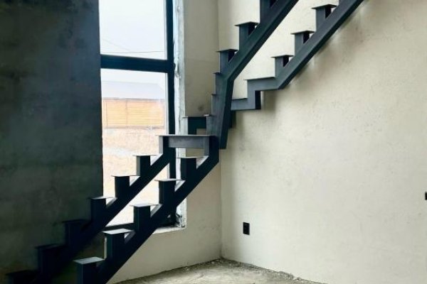 Есть большой шаг вперёд и вверх. Установили лестницу на второй этаж. Да, пока каркас. Но уже занимает свое место, можно продолжать с черновой отделкой.