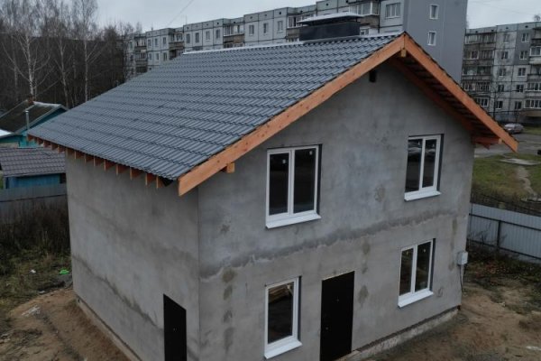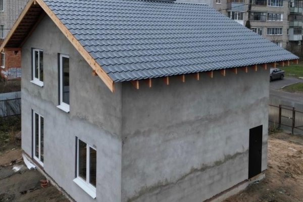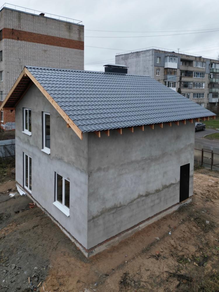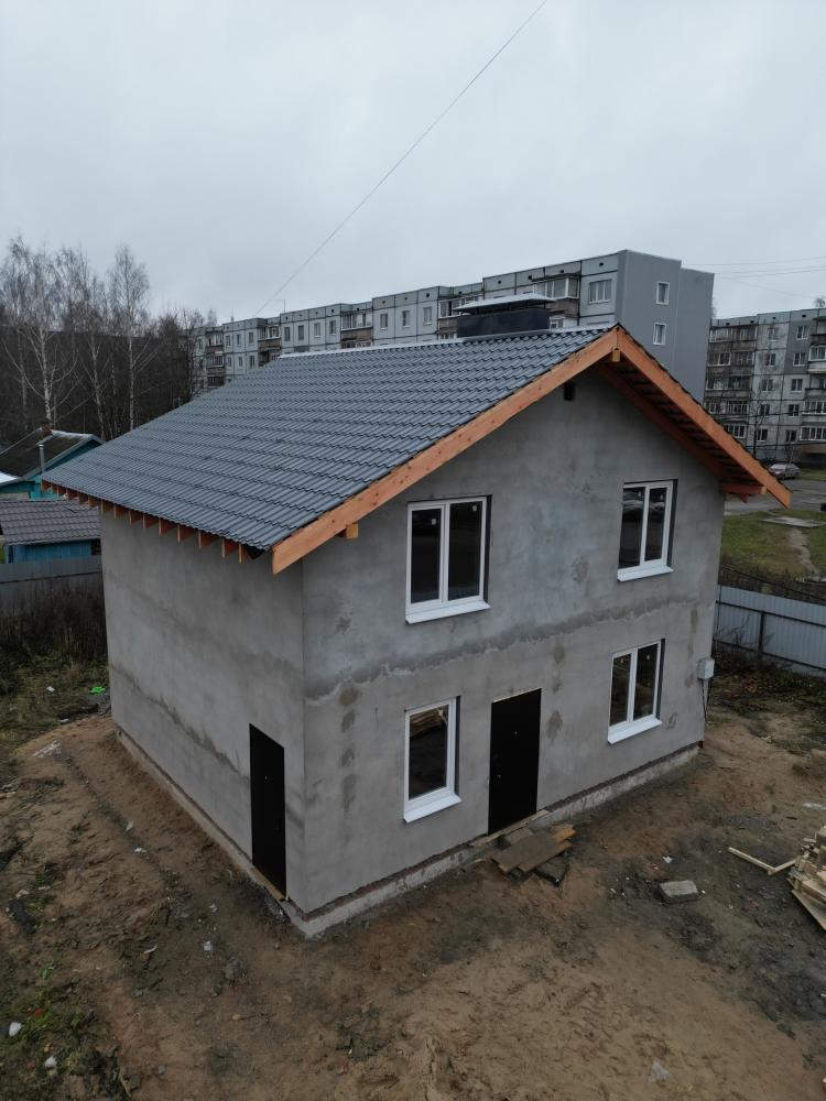 Конструктив готов, уже оштукатурен. Окна и двери на местах. Прям, чувствуем, как из соседних домов смотрят жители и подумывают о таком домике для себя.