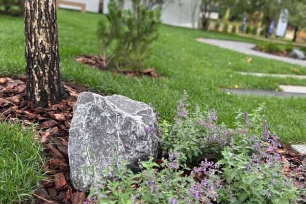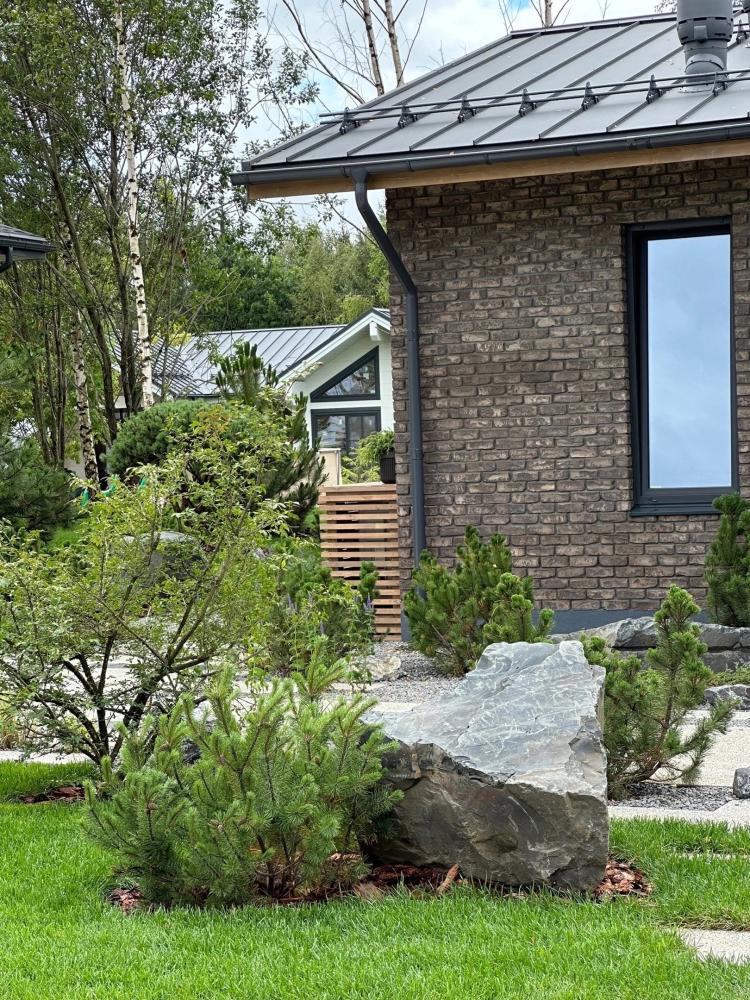 Есть тенденция – сохранение природных участков в том виде, какими они были до стройки. Удалось не задеть ёлочку, пусть растёт. Камень торчит – основание для «альпийской горки». Стоят берёзки группой – шикарно, прямо между ними и кресло-качалка встанет.