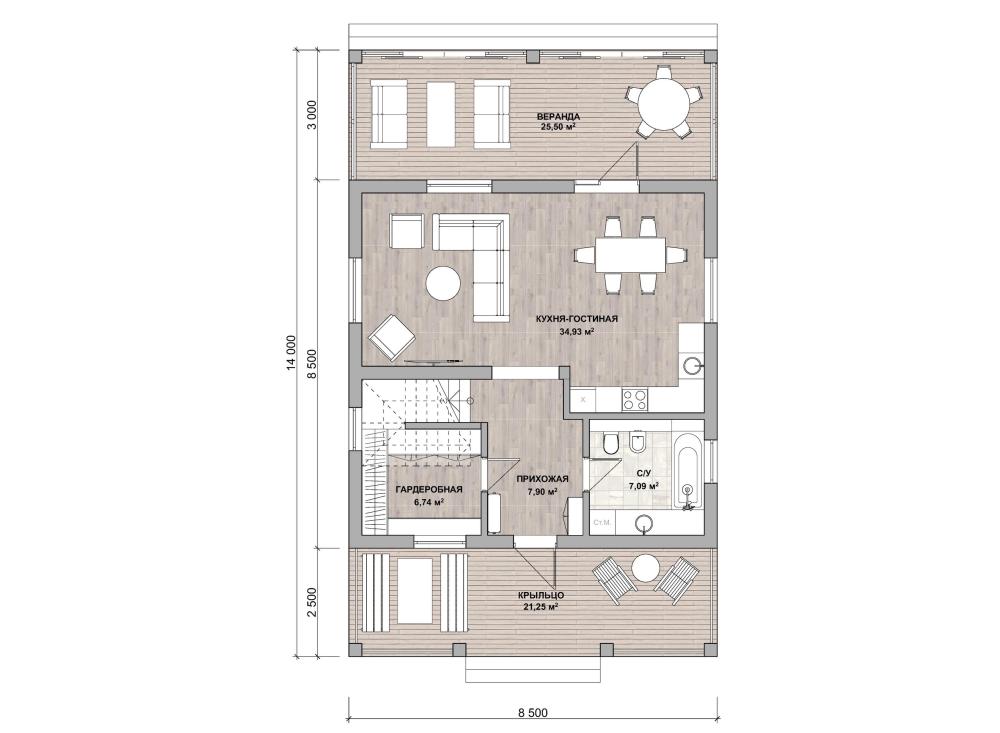 В этом доме 3 спальни, 2 санузла, просторная прихожая и большая гостиная на первом этаже. Отличительная черта – уютная терраса с панорамным остеклением. Пристройка значительно увеличит площадь дома, послужит переговорной, чайной, игровой, кабинетом, спортзалом.