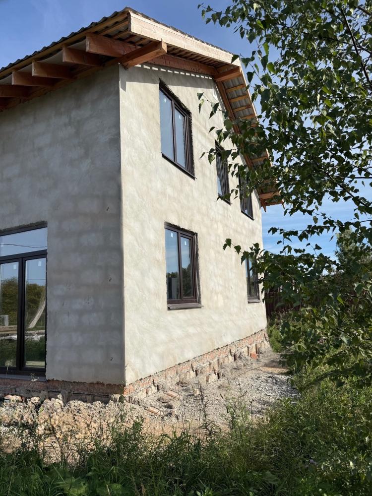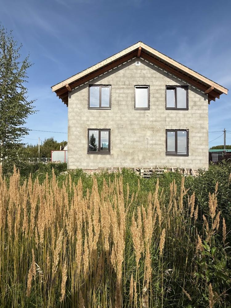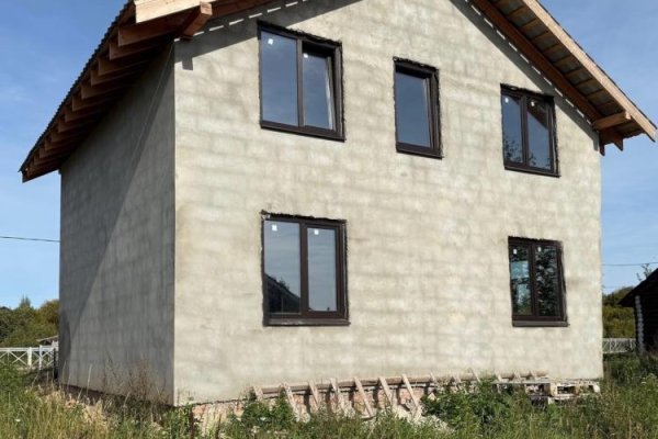 Вот на фото новенький дом. Построен он рядом с Вологдой. Здание большое, уже оштукатурены стены, на местах окна и кровля. Дом полностью закрыт по всему периметру от непогоды, готов к следующим этапам отделки.