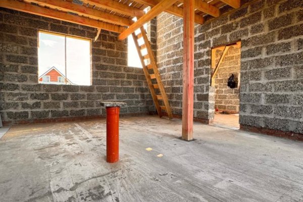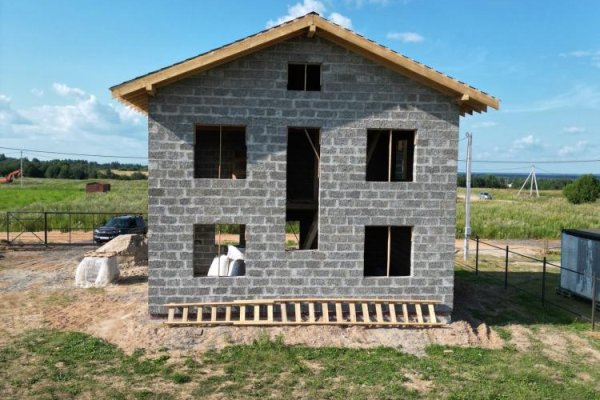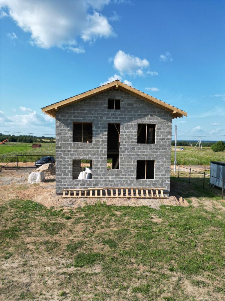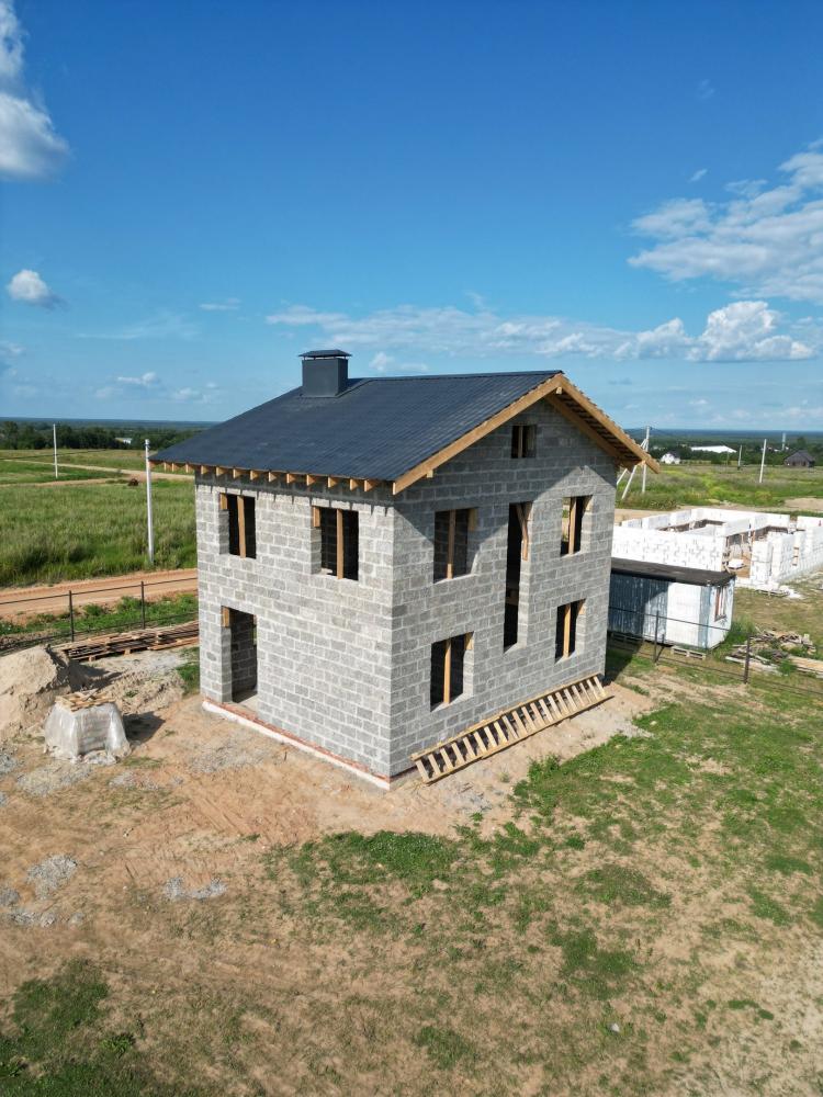 Дом двухэтажный, перекрытия деревянные, фундамент – монолитная железобетонная утеплённая плита. Кровля из металлочерепицы. Готов, голубчик, к началу отделочных работ. В зданиях из арболита усадки ждать не надо.